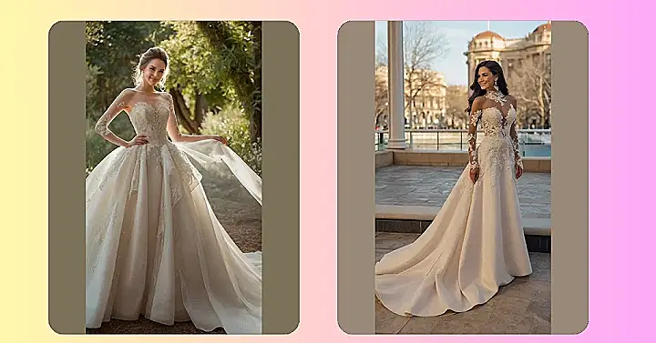 This isn’t your grandma’s wedding dress – it’s modern, stylish, and still totally dreamy. Picture the look on your fiancé’s face when you walk down the aisle in this stunning creation. It’s the perfect blend of classic and trendy, with just the right amount of sparkle (and probably enough fabric to make a small tent!). It’s the kind of dress that makes you feel confident, radiant, and ready to say “I do!” It’s seriously *that* good.