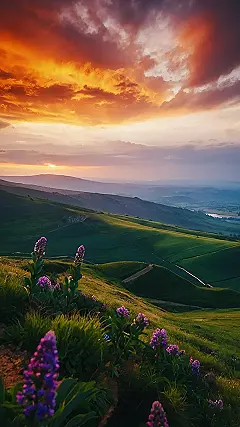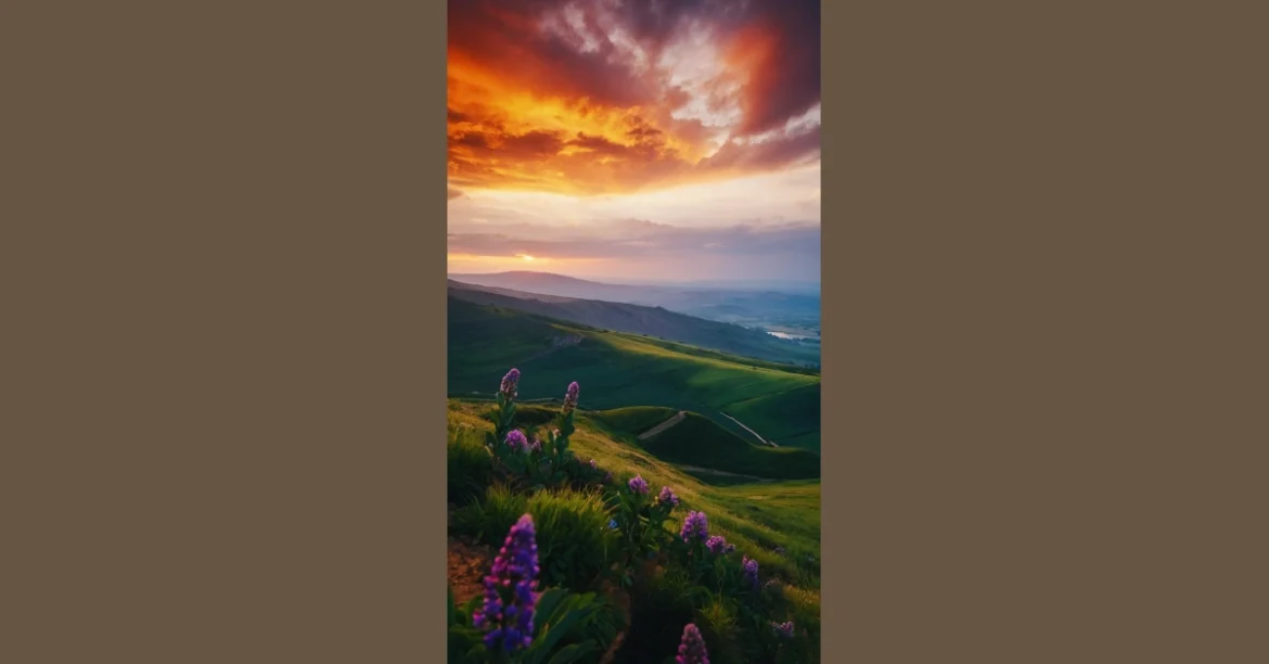 The tiny purple flowers in the foreground make the whole scene even more magical. It’s like they’re saying, “Look at us! We’re part of this awesome sunset too.” The photo makes you want to be right there, standing on that hill, feeling the breeze and watching the sky turn into a thousand different shades of color. Just imagine all the stories these mountains could tell! Maybe they have seen hundreds of amazing sunsets just like this.