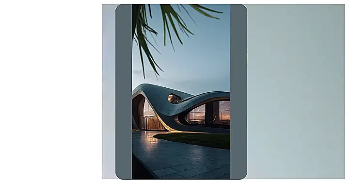 The image shows a futuristic looking building with a super sleek car parked in front. This building is not like your average brick and mortar house. It’s all curvy and smooth, like a giant spaceship landed right in your neighborhood! The building even has pink lights, making it look like a super cool disco from the future! It’s like the architect said, “Let’s forget boring straight lines and build a house that’s fun to look at!”