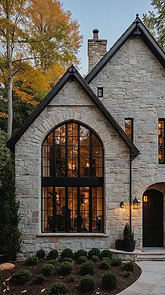Take a look at this house that totally brings the old-school cool of a Tudor home into today’s world. Its rugged stone walls and those dramatically steep black roofs make it look like a friendly fortress ready for any adventure (or just a really good family game night). You can almost imagine knights and princesses living here, except they’d probably have Wi-Fi now and much comfier couches. The classic arched windows and grand double doors give it that awesome, historic vibe, proving some styles are just too cool to ever go out of fashion.