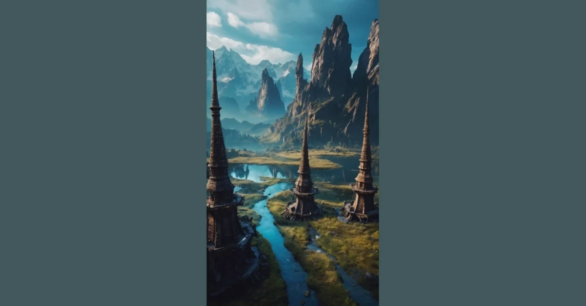 The picture looks like a scene straight out of a fantasy movie, right? Imagine a world where these mysterious towers are ancient, forgotten, and maybe even haunted! The towering mountains are super dramatic, like they’re guarding a secret, and the winding river adds a touch of magic. You can almost hear the wind whispering through the tall grass, making you wonder what kind of adventures are hiding just beyond the mist.