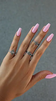 The picture shows a hand with long, pink nails that look like they’re ready to conquer the world! But what’s even cooler are the rings! They’re all different and super stylish. It’s like they’re saying, “I’m here to shine, and I’m not afraid to be myself.” Those rings are definitely adding some extra pizzazz to this already fabulous look.