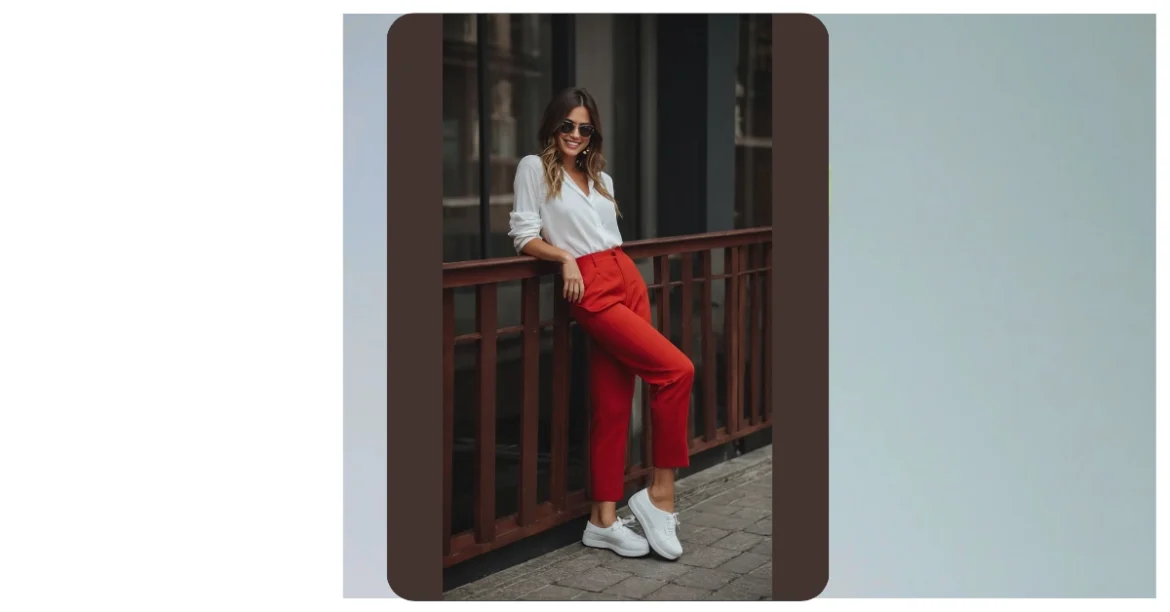 This woman is rocking a seriously cool outfit! She’s got that classic white button-down shirt, but instead of pairing it with jeans or a skirt, she’s gone with bold red pants. It’s like she’s saying “I’m here to make a statement!” And those white sneakers? They’re the perfect finishing touch. She’s got a kind of “I’m cool, I’m confident, and I know how to put together a killer outfit” vibe going on. Who wouldn’t want to look this good?