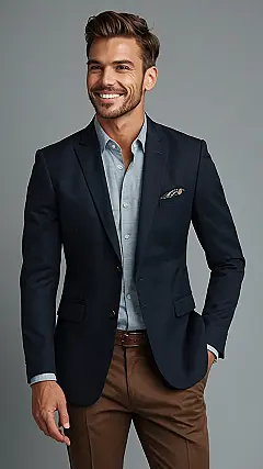 This dude knows how to rock a suit! He’s got a sharp navy blazer, a crisp light blue shirt, and a pair of cool brown pants that make him look like he’s ready to take on the world. It’s like he stepped right out of a magazine, and we’re loving his confident smile. He even added a stylish pocket square for some extra pizazz! This outfit says, “I’m here to impress,” and that’s definitely a look we can get behind.