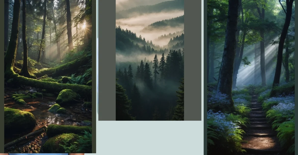 This image looks like something straight out of a fairytale! It’s a mystical forest, full of tall trees that reach up to the sky like giants trying to touch the clouds. The light peeks through the leaves, creating beams of sunshine that look like spotlights on a stage. You can almost hear the whispers of the wind through the trees and the rustling of leaves on the forest floor. It’s a place where your imagination can run wild and you can pretend you’re a brave explorer or a magical creature.