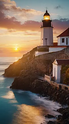 Imagine a lighthouse, perched precariously on a cliff, like a giant sentinel guarding the edge of the world. The sun is setting, painting the sky in a mix of orange, pink, and purple, like someone spilled a rainbow over the horizon. The lighthouse looks like it’s just waiting for a giant wave to come crashing in, but it stands strong, a beacon of hope against the fading light. It’s a scene so beautiful, it’s like a painting, but it’s real, right there in front of you.