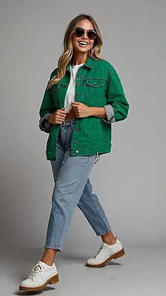And let’s be real, a green denim jacket can go with practically anything! You can dress it up with a fancy dress and heels or dress it down with sneakers and a t-shirt. It’s like the ultimate chameleon of the fashion world. So go ahead, get yourself a green denim jacket and see just how much fun it can be to express yourself!