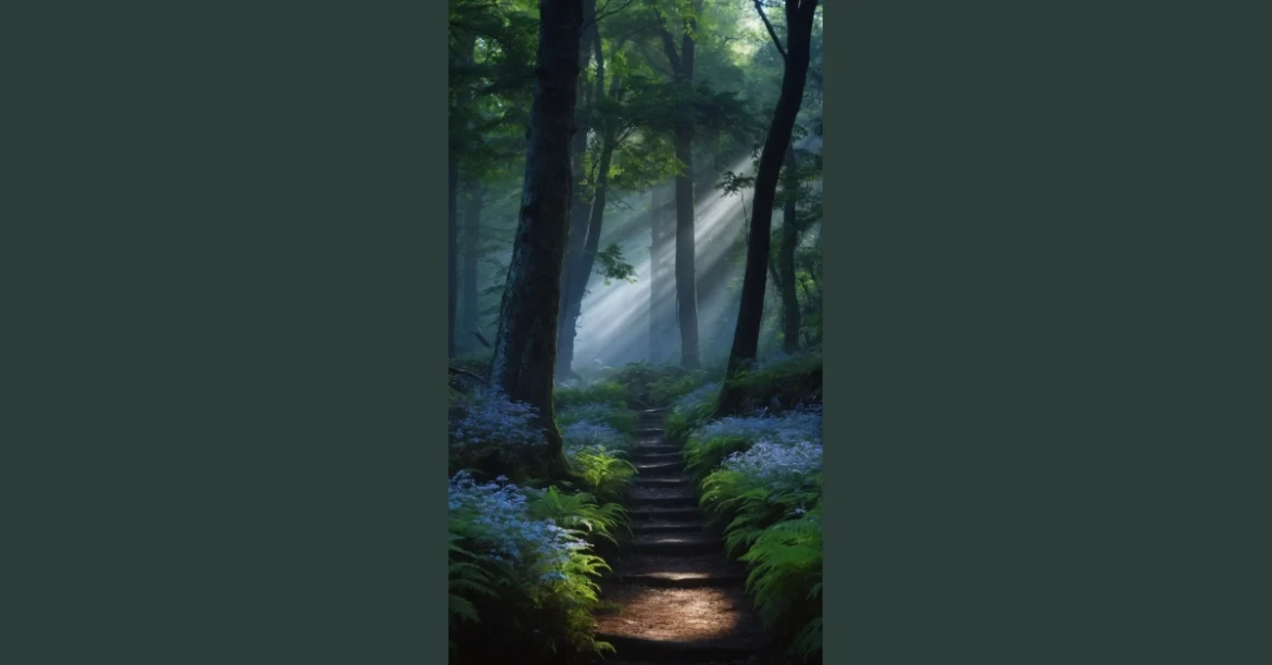 This image looks like something straight out of a fairytale! It’s a mystical forest, full of tall trees that reach up to the sky like giants trying to touch the clouds. The light peeks through the leaves, creating beams of sunshine that look like spotlights on a stage. You can almost hear the whispers of the wind through the trees and the rustling of leaves on the forest floor. It’s a place where your imagination can run wild and you can pretend you’re a brave explorer or a magical creature.