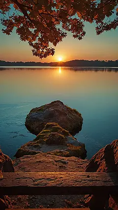 This picture is like a postcard from a chill, peaceful place! You’ve got the sun setting over a lake, painting the sky in all sorts of pretty colors, and there’s even a cute little island in the middle of it all. It looks so relaxing, like a perfect spot to sit and watch the world go by, maybe with a cup of hot cocoa (or maybe a milkshake, if you’re feeling adventurous).