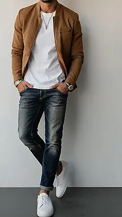 This guy knows his way around a classic men’s clothing style! It’s like he just stepped out of a fashion magazine, but in the best way possible. He’s rocking a brown bomber jacket, which is totally timeless, and those jeans? They’re perfect! He’s got the whole “I’m cool and collected” vibe going on, but without trying too hard. It’s like he knows exactly what to wear to look effortlessly stylish. You gotta love a guy who knows how to put an outfit together, right?