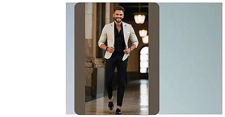 This guy knows how to rock a formal outfit! He’s got the classic black pants and shirt combo, but he’s added a touch of personality with a light beige blazer. It looks like he’s ready for a night out on the town, maybe even a fancy school dance. The way he’s smiling makes you think he’s got a date with someone special, and he’s feeling confident and ready to impress. His shoes are pretty awesome too, with a sharp, polished look that completes his whole look.
