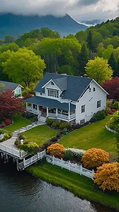 This picture is like a postcard from a dream! Imagine waking up in that white house with the porch swing and the mountains in the background. You could sip your coffee and listen to the birds chirping, or maybe take a dip in the cool water. It’s the kind of place where you can just relax and let all your worries drift away.
