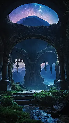 Imagine stumbling upon a forgotten ruin in the heart of a mystical forest. It’s like stepping into a scene from your favorite fantasy book! This ancient stone archway, overgrown with moss and vines, leads to a hidden world bathed in the soft light of a starry night. The archway is cracked and crumbling, whispering secrets of forgotten times and magical creatures. It looks like a gateway to a secret world, where adventures await!