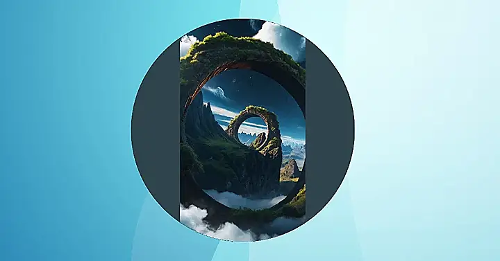This picture makes me think of a super cool fantasy world! Imagine a land with mountains so tall they look like giant rings, and they’re even covered in grass and trees! It’s like someone took a bite out of the sky and left a magical doorway in the middle of the land. You could probably climb up there and see the whole world, maybe even find a secret passage to a magical place, like a hidden valley filled with talking animals and sparkly rivers!