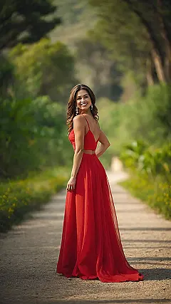 This lady in red is definitely turning heads! Her outfit is a total show-stopper, with a flowy skirt that looks like it could fly away with the wind. It’s like she’s straight out of a fairytale, and her smile is so bright, it’s probably contagious. I bet everyone was stopping to stare as she walked by, wondering if she was a princess in disguise or just a regular girl with amazing style.