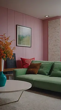This living room is like a warm hug on a chilly day. The soft, fluffy rug feels like you’re sinking into a cloud, and the big, green couch just begs you to curl up with a good book. The pink walls add a touch of personality, and the cool blue vase makes the whole room feel fresh and inviting.