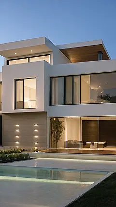 This house is like a giant, fancy Lego set! It’s all sharp angles and clean lines, with big windows that let in tons of light. The color scheme is super simple, like a blank canvas just waiting to be filled with your awesome personality. It’s the kind of place where you can just relax and enjoy the view – or maybe just chill out in your super cool, minimalist living room.
