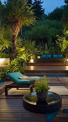 The picture shows a beautiful outdoor space that looks like it was designed by a nature-loving ninja! Imagine relaxing on that comfy-looking lounge chair, surrounded by lush greenery and the gentle glow of lights. You could spend hours soaking up the peaceful atmosphere, maybe with a good book and a cool drink. It’s the perfect place to escape from the hustle and bustle of everyday life and reconnect with the calming vibes of nature.