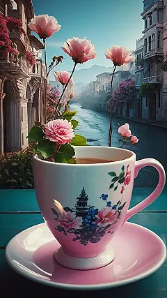The teacup is so cute! It has beautiful pink and blue flowers all over it, like a little garden. The flowers in the background make it feel like you’re right in the middle of a dream. It’s almost like the flower from the cup sprouted and grew into a beautiful little tree! Now that’s what I call a beautiful morning.