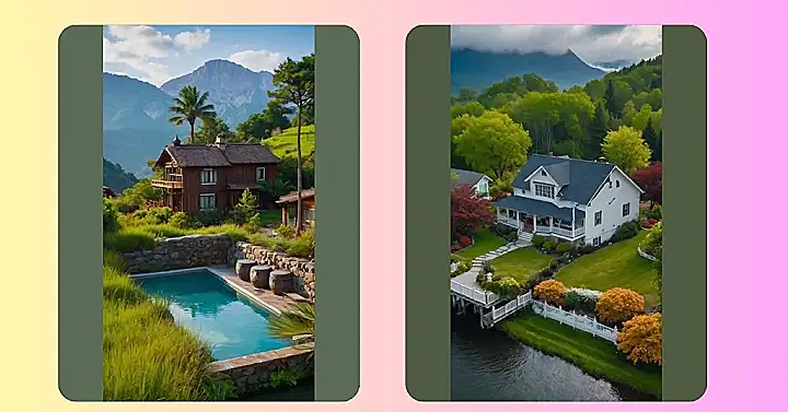 This picture is like a postcard from a dream! Imagine waking up in that white house with the porch swing and the mountains in the background. You could sip your coffee and listen to the birds chirping, or maybe take a dip in the cool water. It’s the kind of place where you can just relax and let all your worries drift away.