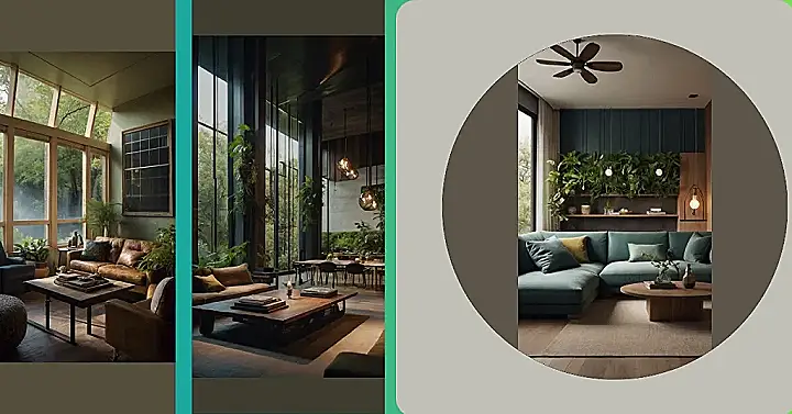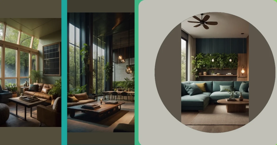 Imagine a room where you can relax and feel like you’re surrounded by nature, even when it’s raining outside. That’s what this “Nature Living Spaces” photo is all about! Just look at that huge, beautiful window that brings all the green trees and sunshine right into your living room. It’s like you’re sitting in a treehouse, but way more comfy thanks to that big, comfy sofa. And don’t forget the cool coffee table that looks like it was made from a giant tree trunk! It’s like a slice of nature right in your house, making your home feel more like a cozy forest cabin.