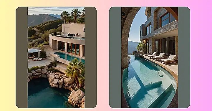 This house is so fancy, it probably has a butler who brings you ice cream while you’re floating in the pool! Imagine being able to just chill on that comfy-looking lounge chair and soak up the warm evening air. It’s like a scene straight out of a movie!