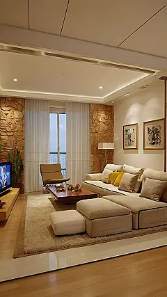And don’t even get me started on the cozy vibes! The stone wall adds a touch of rustic charm, and the neutral colors create a calming atmosphere that’s perfect for winding down after a long day. This living room is basically a hug in furniture form, and honestly, who wouldn’t want that?
