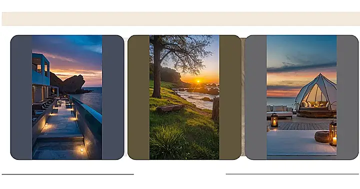 This image is a total vibe check! Just imagine yourself relaxing on a comfy bed inside a giant tent, with the sun setting over a shimmering ocean. You could totally forget about schoolwork or chores here. Maybe even just relax and read a good book or listen to some chill music. It looks like the perfect place to escape for a while and just unwind.