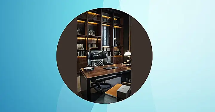 This office is seriously fancy! It looks like something out of a movie where the main character is a super-smart detective or a powerful businessperson. You’ve got this huge, dark wooden desk with a fancy leather chair. The shelves are loaded with books, like they’re about to spill out, and even the lamp looks like it’s worth a fortune. This office is all about making a statement – like, “I’m in charge, and I’m here to get things done!”