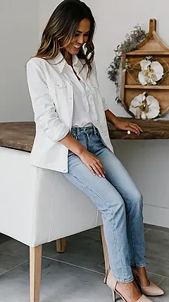 This girl is rocking a seriously comfy look, and the key to her effortless style? You guessed it – women’s denim! Those light-wash jeans look super soft and comfy, like they’d be perfect for lounging around the house or going out for a casual coffee date. But here’s the best part: they’re paired with a stylish white jacket, which instantly elevates the whole vibe! This outfit is proof that jeans can be anything you want them to be – casual, cool, or even a little bit fancy.