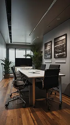 This office looks so fancy, it’s almost like a spaceship! You’ve got sleek, modern furniture that makes you want to spin around in your chair like a rocket. The big window lets in a lot of light, which is great for working, but maybe a little too bright for a nap in the afternoon. They even have these cool plants to make the room feel more alive, like a giant jungle in the city. It’s like they took inspiration from a science fiction movie, which is pretty awesome, except maybe the office meetings will go on forever.