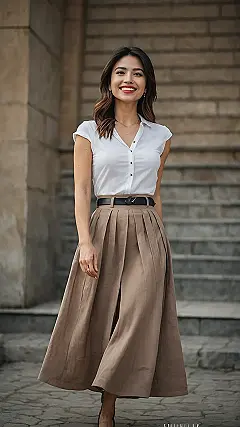 This outfit is like a chameleon – it can go from super fancy to super chill! The skirt is flowy and elegant, but the white shirt and simple belt make it perfect for a casual day out. Imagine rocking this look at a coffee shop with your friends or strolling through the park. It’s the kind of outfit that makes you feel confident and comfortable, no matter what you’re up to.