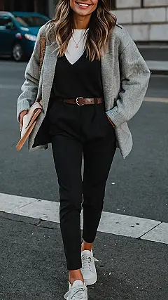 This outfit screams “I’m ready for fall” without being too over-the-top. It’s like a comfy hug for your body, but way more stylish. You’ve got the classic combo of black pants and a white tee, but the comfy cardigan adds a touch of warmth for when the weather turns chilly. And those white sneakers? They’re like a little dose of sunshine on a gloomy day. Seriously, this look could totally pass for “fall fashion goals.”