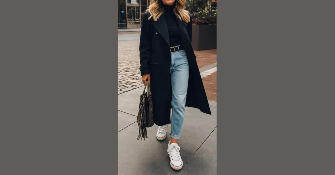 This outfit is perfect for when the weather is chilly, but you still want to feel comfy and stylish. The long, black coat is like a warm hug, while the jeans and Converse keep things casual and trendy. It’s like a reminder that even when the leaves are changing, you can still rock your favorite sneakers!