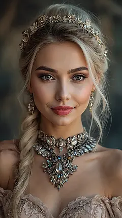 Forget simple hair; this look is all about the glam! With luscious blonde locks styled into elegant waves and a graceful braid, topped off with a shimmering golden tiara, it’s like Tinkerbell decided to raid the royal jewels and declare herself queen. And that necklace? It’s so stunning and intricate, you could probably find a map to a hidden treasure chest just by staring at all its sparkly gems. Who needs a tiny poof of hair when you can have hair this epic and shine brighter than any fairy light?