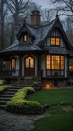 This isn’t your grandma’s gingerbread house; it’s way cooler! Imagine stumbling upon this adorable, slightly spooky fairytale house nestled deep in the woods on a misty evening. The warm glow from the windows peeking through the dark, gothic-style architecture makes it feel both magical and mysterious, like something straight out of a storybook. You half expect a friendly witch or a mischievous gnome to pop out and offer you some enchanted tea.