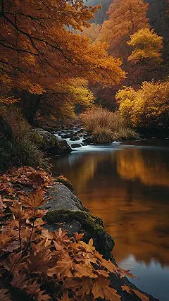 And then you see it… a small stream winding its way through the trees. It’s so clear you can see the bottom, and the reflection of the leaves on the surface is breathtaking! It’s like nature’s own mirror, reflecting the beauty of the season. And who knows, maybe a few playful fish will be hiding in the depths, watching the leaves drift by!