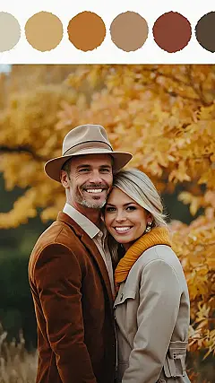 The color palette in this image is like a warm hug. The brown tones of the clothes match the colors of the leaves, making the whole scene feel like a cozy fall day. The woman’s outfit is a bit more neutral with a light beige coat, but she adds a burst of color with a bright yellow scarf. The man’s outfit, with its rich brown jacket and hat, is a perfect example of how to use fall colors in a stylish way. You could even try to incorporate some accessories, like a cute beanie or a plaid scarf, to complete the look. With a little bit of inspiration, you’ll be ready for some picture-perfect family photos!