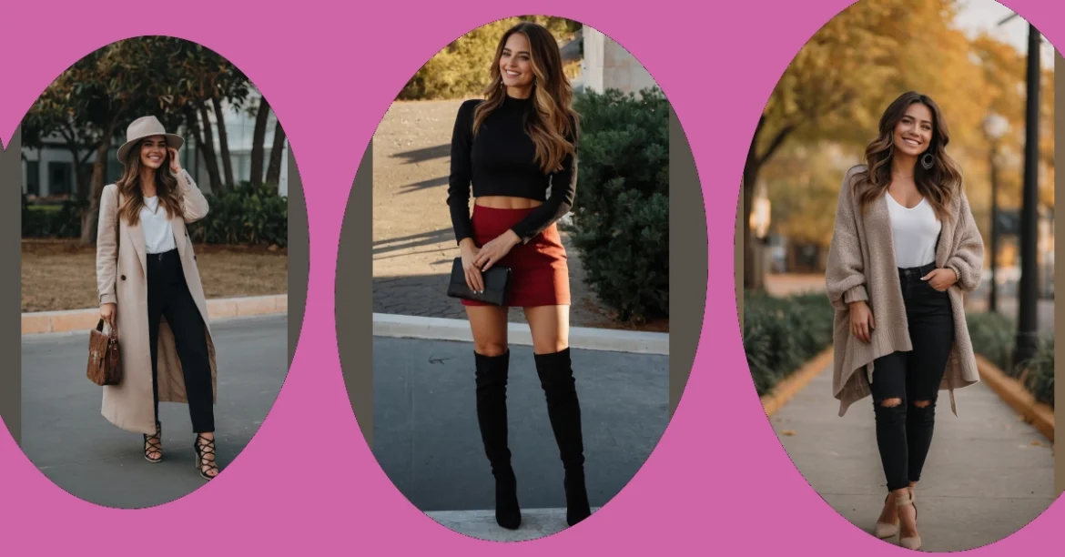 This outfit is totally rocking the “casual chic” vibe. A comfy black sweater, a bold red skirt that pops, and knee-high boots that are fierce but still comfortable? It’s like the fashion gods themselves said, “You go girl!” Plus, her smile is contagious! It’s like she knows she’s got the ultimate fall fashion formula down to a science. Who needs a pumpkin spice latte when you can look this good?!