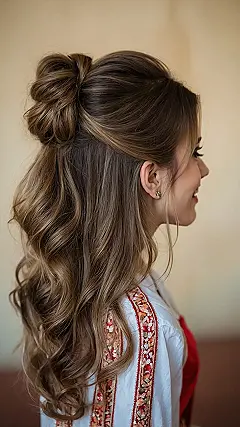 Fall is basically calling, and your hair needs to answer with style, right? This look, with its cool half-up ponytail and those effortlessly wavy locks, is like the perfect autumn accessory. It’s awesome for keeping your hair out of your face when you’re navigating through falling leaves or trying to sip that pumpkin spice latte without a hair getting in the way. Plus, it gives off major ‘I woke up like this, but better’ vibes, which we all know takes a secret amount of effort!