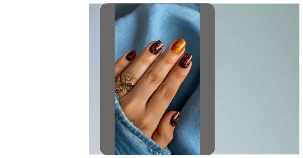 And don’t even get me started on those leaf-shaped rings! They’re just the perfect touch of autumnal charm. It’s like someone said, “Let’s put all the best parts of autumn on these nails and rings, and call it a day!” If I had these nails and rings, I’d be ready to walk through a pile of crunchy leaves and sip some hot cider.