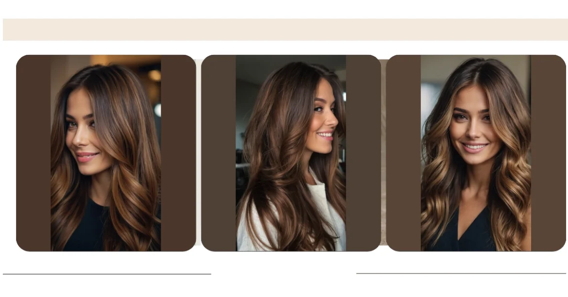 The picture shows hair that looks like a warm hug for your locks. It’s all about beautiful brown hair with streaks of lighter brown, like the leaves changing color in the fall! It’s like taking the best parts of summer, those golden rays of sunshine, and bringing them to your hair.