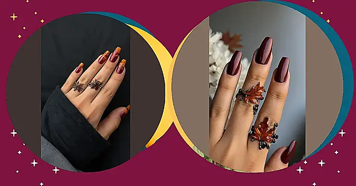 And don’t even get me started on those leaf-shaped rings! They’re just the perfect touch of autumnal charm. It’s like someone said, “Let’s put all the best parts of autumn on these nails and rings, and call it a day!” If I had these nails and rings, I’d be ready to walk through a pile of crunchy leaves and sip some hot cider.