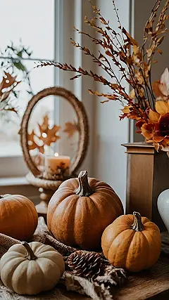 Pumpkins, pine cones, and a warm candle – what more could you ask for in fall decor? These classic elements can be dressed up or down depending on your style. They’re like the comfy, neutral sweater you can wear to a fancy dinner or a casual movie night. This image shows a simple, elegant way to embrace the season, with a focus on natural colors and textures that are both stylish and welcoming.