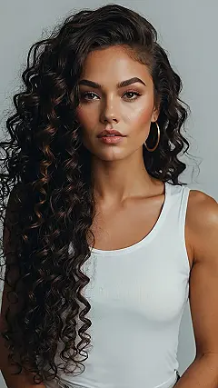 This picture is all about embracing those gorgeous autumn vibes! The model’s long, flowing curls are like the perfect way to transition from summer’s carefree waves to fall’s cozy and chic style. Imagine the feeling of the wind blowing through her hair as she walks through a park, the leaves crunching under her feet – pure autumn magic! Plus, those big, brown eyes could make even a pumpkin jealous. This look is definitely something to get inspired by this season!