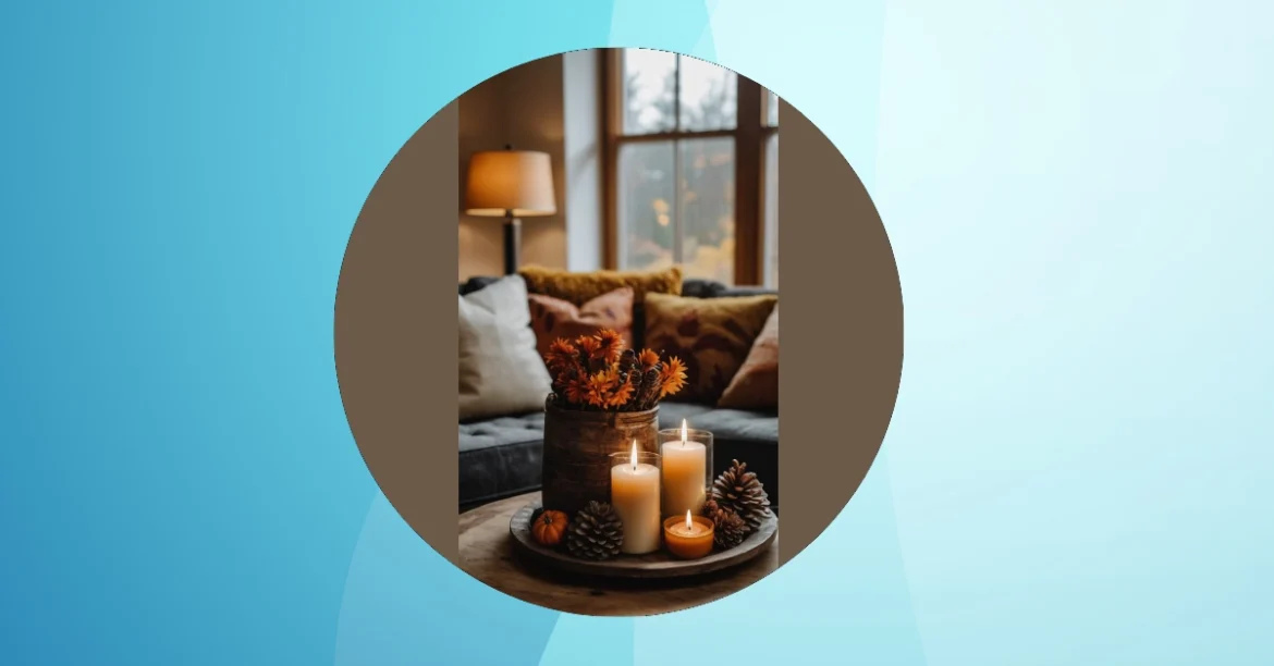 The image is a perfect example of cozy fall decor. There’s a rustic wooden tray piled high with pumpkins and glowing candles. The soft light from the candles makes it look warm and inviting, like you could just curl up next to it with a blanket and a good book. You can almost smell the cinnamon and nutmeg just by looking at it! It’s like a little piece of autumn magic.