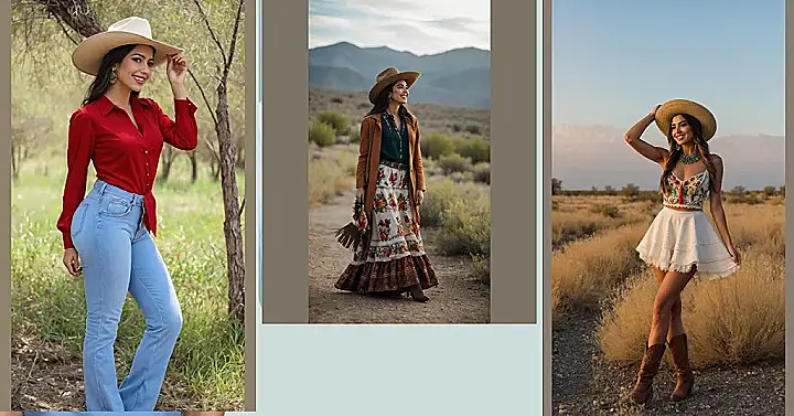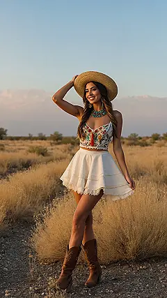 Now, what’s a fantastic Mexican rancho outfit without the right accessories? We’ve got the straw hat, which is perfect for keeping the sun out of your eyes (or just adding an extra dash of cool to your look), and those essential cowboy boots. Who knew boots could look so good with a mini skirt? This whole ensemble radiates “I’m ready for a fancy dinner, but also might spontaneously jump on a horse.” It really proves that rancho style isn’t just for the actual ranch; it’s for showing off your confident, fun-loving spirit wherever you wander!