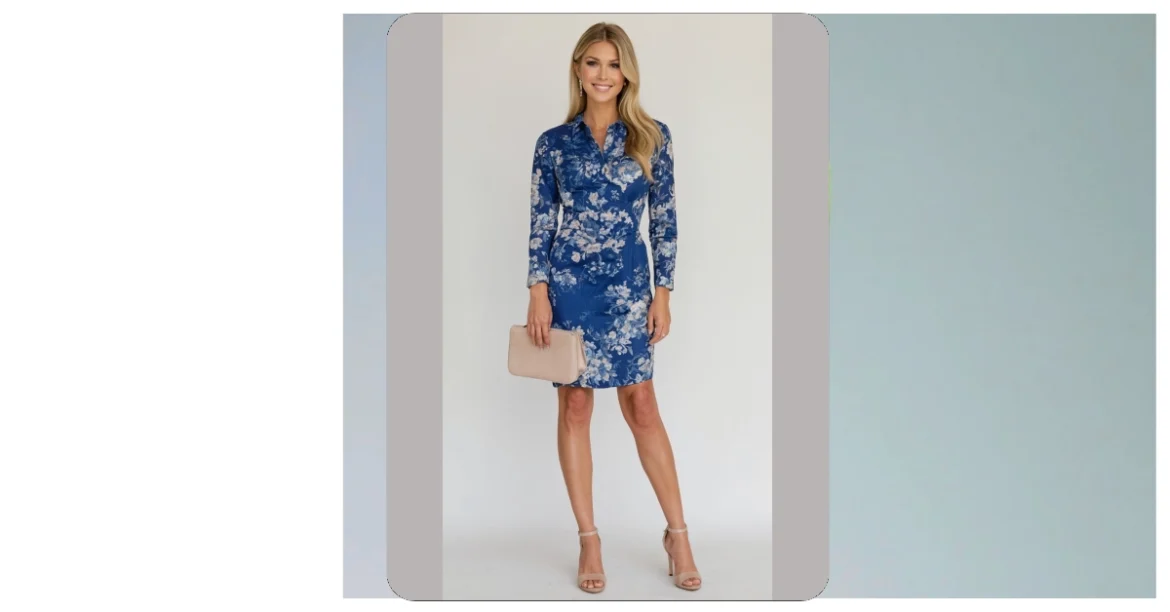 The best part about this ‘mini’ marvel is how it swings just right, letting you show off those awesome shoes – whether they’re cute heels like hers or your favorite pair of sneakers for maximum zoom. That delicate blue pattern and the cinched waist give it a polished look, making it perfect for anything from a casual hangout to pretending you’re a super important CEO (or maybe just going to get ice cream). With a dress this effortlessly cool, you’ll be smiling like our photo-ready friend, ready to tackle your day with comfort and major style points!