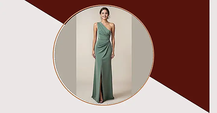 Wow, this long gown design is seriously giving off major main character vibes! The one-shoulder look is super chic, and the pretty sage green color looks like it belongs in a fairy tale, or maybe just a really fancy school dance. Just picturing trying to navigate through a crowd in this without stepping on the hem is a workout itself, but totally worth it for that elegant swirl factor. It’s the kind of *long gown design* that makes you stand a little straighter and feel like you should be accepting an award for “Best Dressed While Also Secretly Thinking About Snacks.”