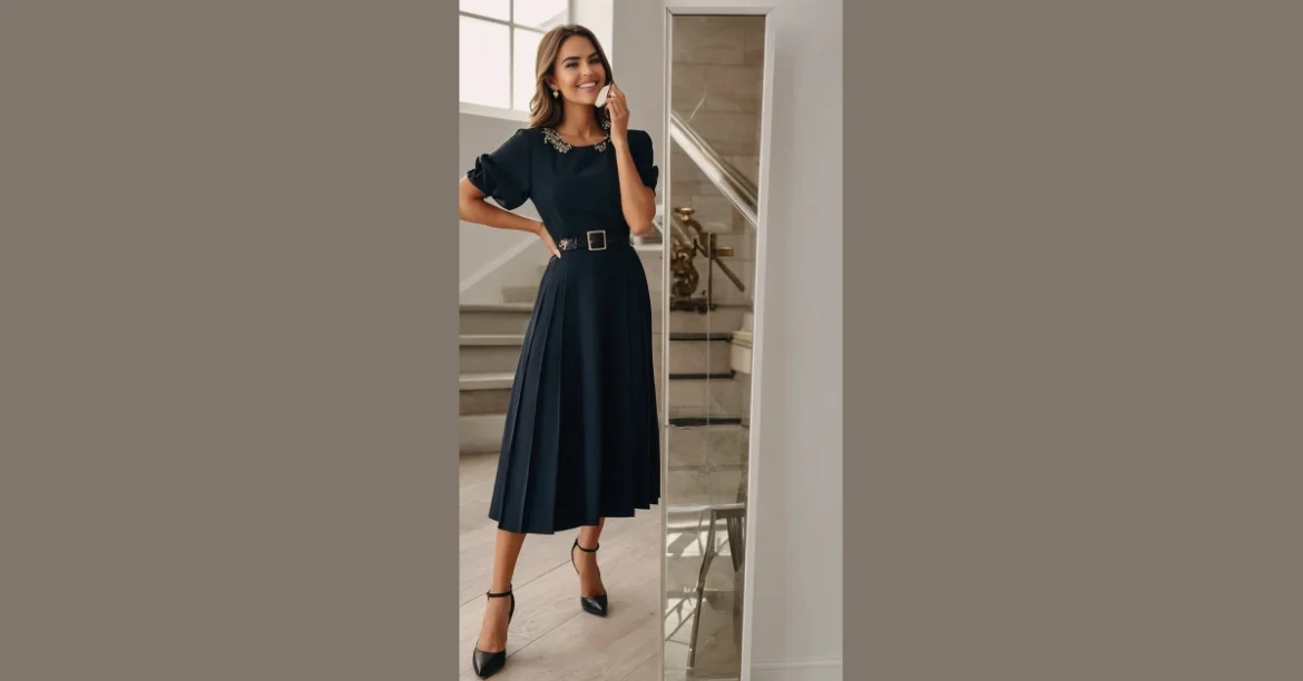 This navy dress is like a superhero costume for your workday! It’s got that perfect mix of professional and stylish – you know, the kind of outfit that makes you feel ready to conquer the world (or at least that important presentation). The pleated skirt adds a touch of fun without being too flashy, and that little embellished neckline is just enough sparkle to let your personality shine through. Plus, who doesn’t love a comfy dress that can take you from meeting to coffee break without a second thought?